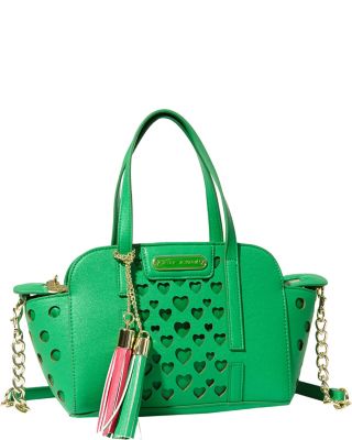 Stay a fashion beat ahead of the trend with this faux-leather small satchel detailed with romantic heart-shaped cutout detailing. Featuring fun tassel key chains and signature hardware, it's certain to set any look aflutter. •Man-made materials •Top-zip closure •Dual carrying handles; removable chain-link crossbody shoulder strap.